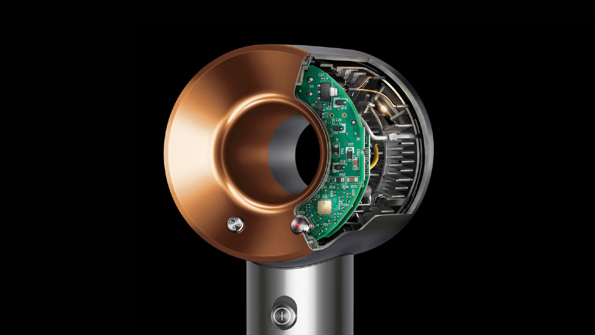 Mažas galingas Dyson skaitmeninis variklis V9 sukasi iki 110 000 sūkių/min. greičiu. Pasitelkus Air Multiplier™ technologiją, sukuriamas didelio slėgio, labai greitas reguliuojamo oro srautas, kad greitai išdžiovintų ir preciziškai suformuotų plaukus.