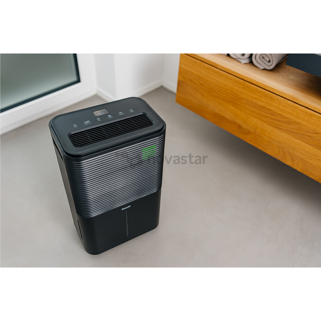 Beurer LE 250 air dehumidifier ensures particularly fast and efficient air dehumidification, and is useful, for example, in helping to dry out new buildings, water damage or generally high indoor humidity in living and working spaces, bathrooms and basements. Using it can even prevent mould, condensation and musty odours. Highly efficient humidity control is possible thanks to the coloured indicator which displays the current humidity level.