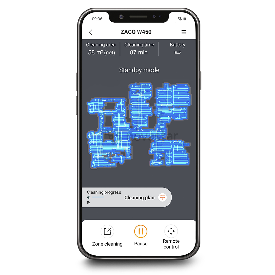 With the help of 3 different modes, the ZACO W450 is able to optimally and individually clean the room depending on the situation. The Path mode is particularly suitable for larger rooms. The area mode in turn cleans a defined zone and the spot mode circles around a particularly dirty point.