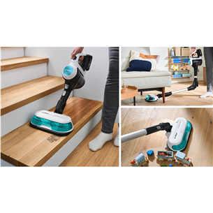 The 2in1 DynamicAqua Mop combines powerful vacuuming through the suction channel with thorough mopping using two Power Spinning Pads. These actively rotating pads are kept wet continuously thanks to the Automated Water Dosage system which always ensures the right amount of moisture on the pads. Even stubborn stains are removed easily. The pads remove dirt of all kinds from almost any type of hard floor such as vinyl, stone, tiles and even sealed wooden floors.