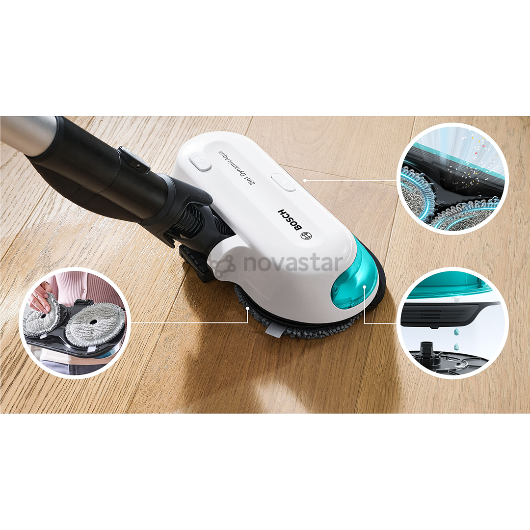 The Bosch DynamicAqua 2-in-1 cordless vacuum cleaner and mop offers powerful suction and thorough mopping in a single device. The HEPA filtration system and innovative features ensure clean air and excellent cleaning results, making home maintenance simple and efficient.