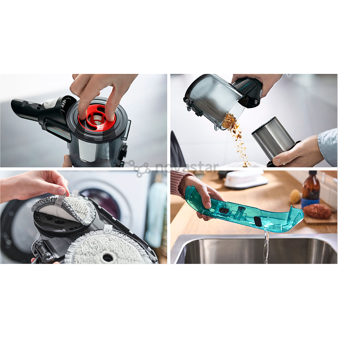 The maintenance is very convenient and hygienic. Simply empty the fresh water tank if it isn't already empty. Thanks to the special tags on the mopping pads, the pads can be removed and put into the washing machine without you having to touch them. The reusable pads can be washed at 40°C in the washing machine or they can be handwashed. For hygienic reasons we recommend machine washing them after each use. The dust box is also easy and hygienic to clean. Empty it directly into the bin.