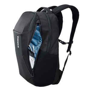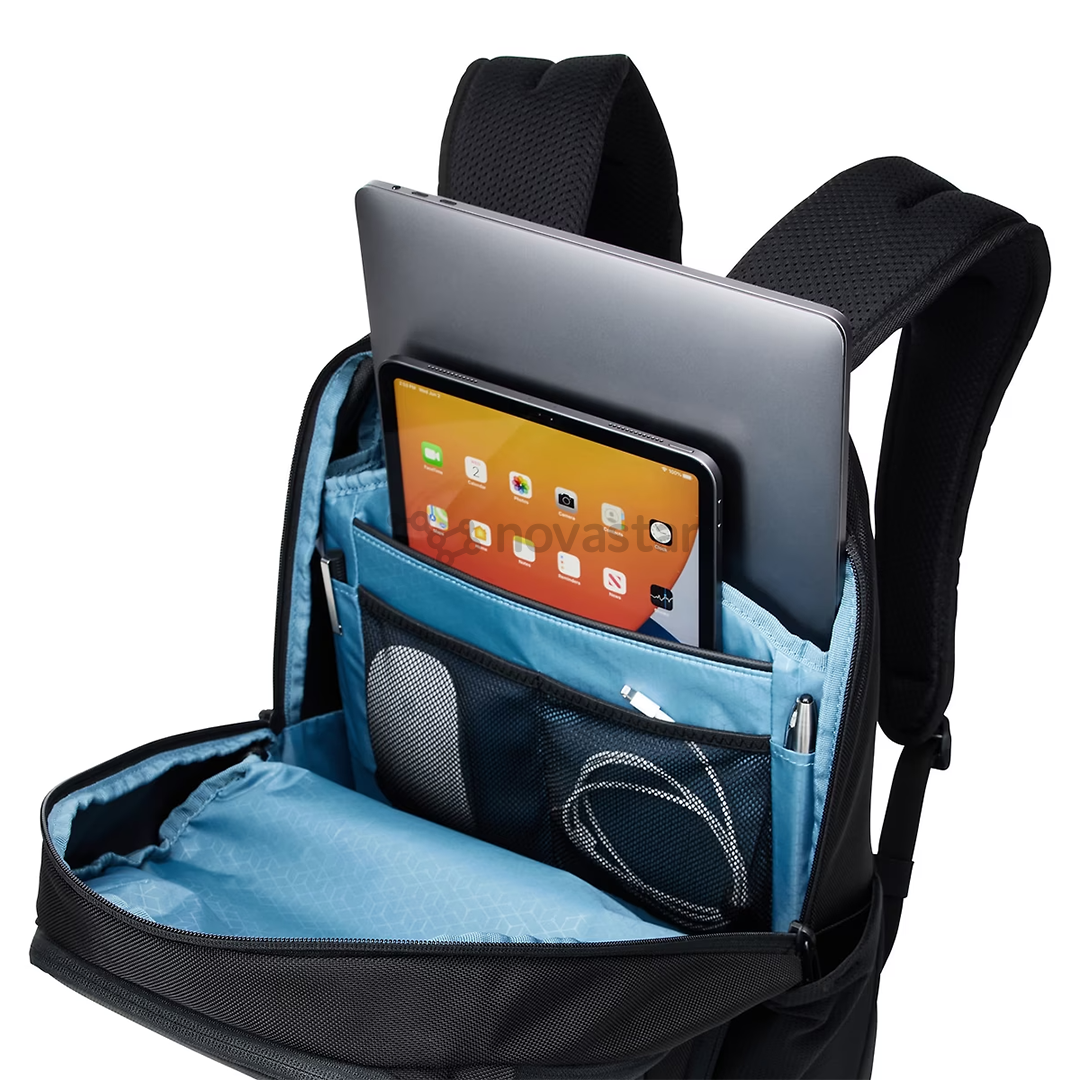 • Dedicated storage pockets protect a 15.6-inch PC or 16-inch MacBook® and 10.5-inch tablet • Protect your phone, sunglasses and other valuables with the SafeZone compartment, which has a hidden pocket behind the removable hard case • Equipment can be stored in a spacious side-opening drawer with a separate mesh pocket for smaller items • In the inner pockets, small items stay in place and are easily accessible • The handle tunnel allows the bag to be securely attached to a wheeled suitcase for easier travel • A water bottle can be conveniently stored in the side pocket, and small items can be safely placed in the zippered side pocket • Mesh-covered EVA shoulder straps and an adjustable chest strap increase comfort when wearing • Made from GRS certified 100% recycled 1680 polyester with YKK zippers
