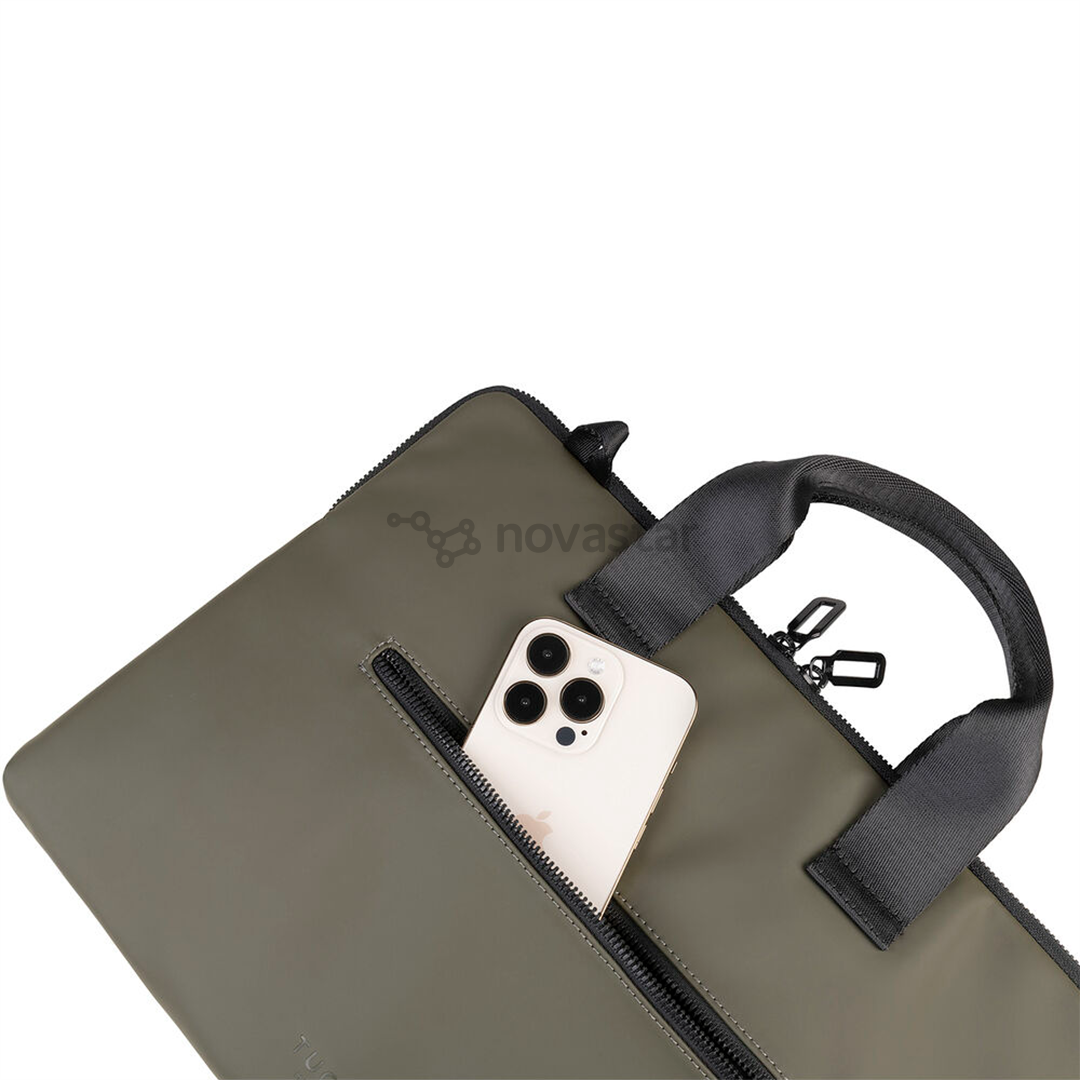 Minimal-sporty design bag for 14" laptop or 15'' MacBook, made of rubberized material. Features a large single compartment with an interior laptop pocket and an exterior accessory pocket.