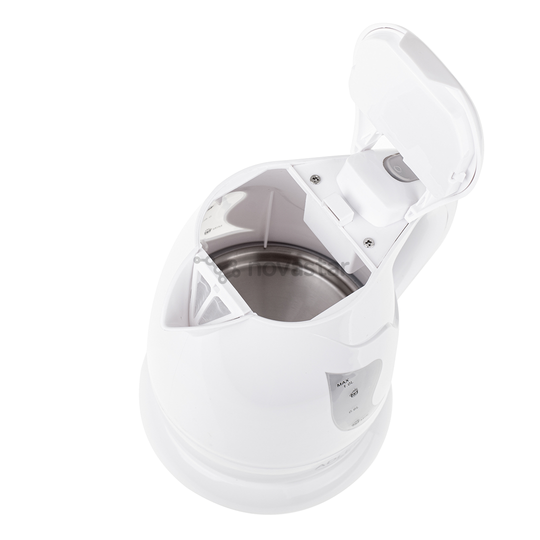 • High grade flat stainless steel heating element • Automatic protection against boiled without water • Sediment filter • Control lamp • Double-sided water level gauge equally convenient for right- and left-handed users • Automatic switch off • Swivel base 360° • Housing made from durable polypropylene • Compact baseplate with cord storage • Open lid switch