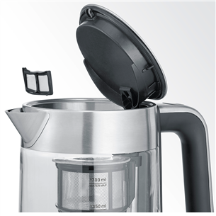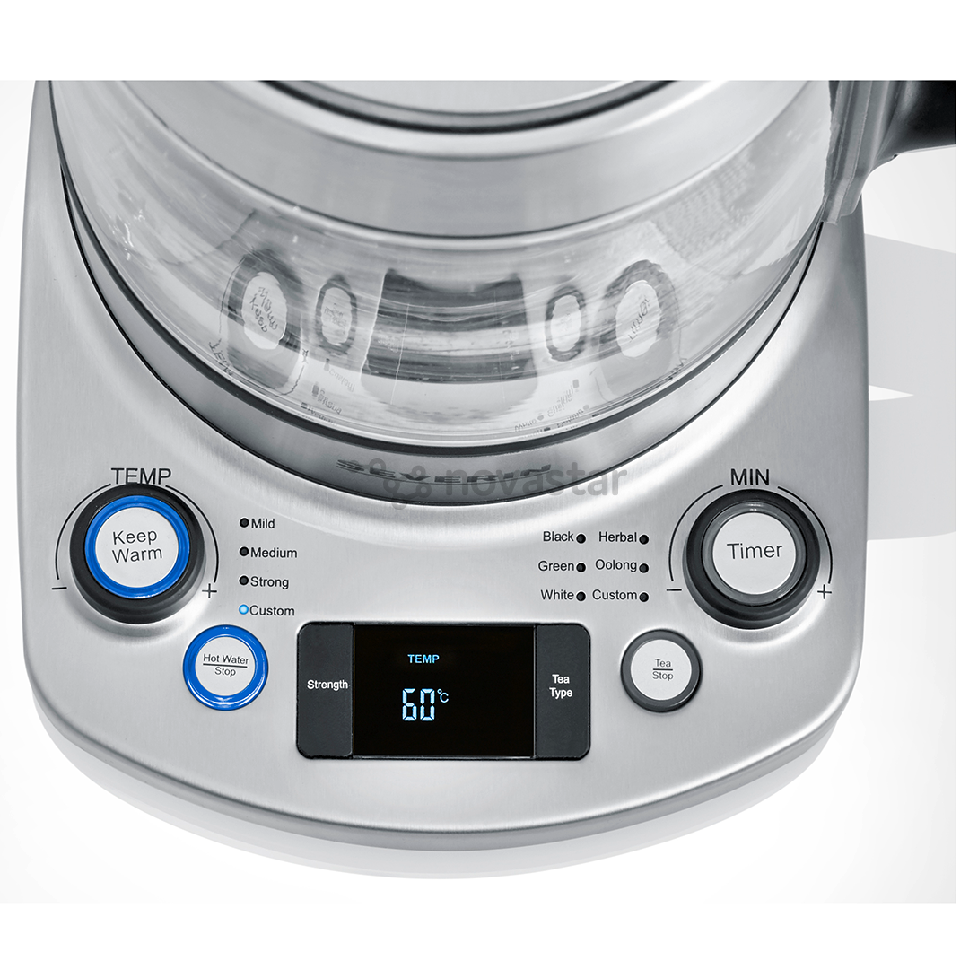 • Tea strainer with innovative automatic lift function: Automatic raising and lowering of the integral tea strainer ensures optimal flavour • Individual temperatures & steeping times: Temperature level selectable from 40°C – 100 °C in 5 °C-steps; steeping times from 1- 15 minutes • Easy-Tea-Select-Function: 5 pre-set tea programmes with matching steeping times and quick-boil function for water • Fast-Boil-Power: Powerful 3.000W for accelerated heating, reaching boiling point 50% faster • Keep Warm and Timer function for the perfect tea experience • Be-Silent-function: Beep-Sounds could be activated/deactivated upon request
