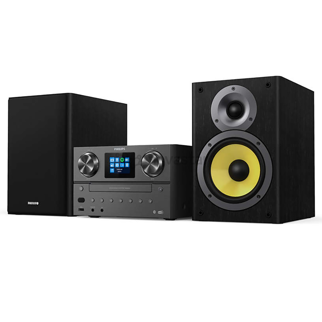 Užpildykite savo kambarį mėgstamais garsais. Ši patraukli mikro sistema suteikia galimybę mėgautis interneto radiju, „Spotify Connect“, „Bluetooth“ ryšiu ir CD grotuvu. Taip pat galite klausytis DAB+ arba FM radijo – visa tai su galingu 100 W garsu.