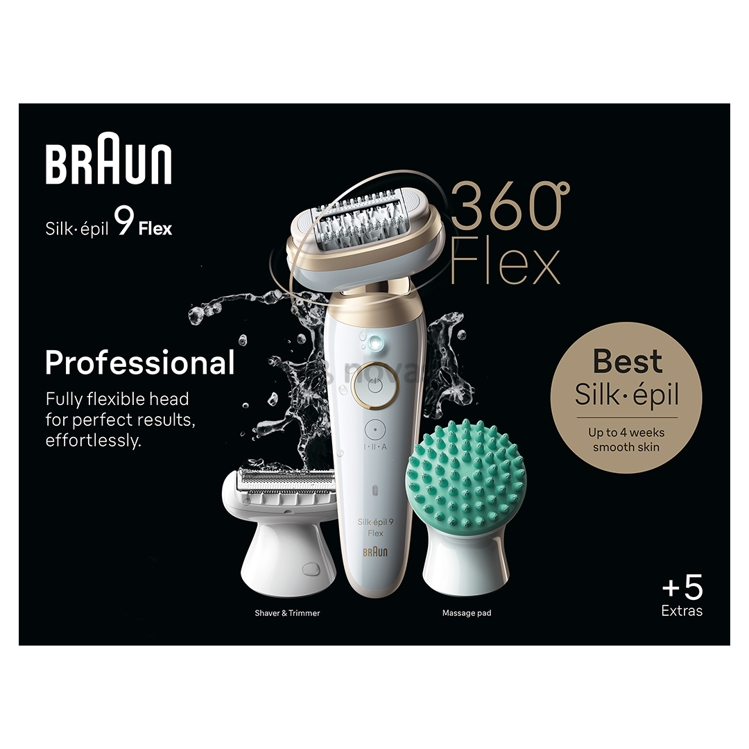 Braun Silk-épil 9 epiliatorius suteikia galimybę naudoti tiek sausuoju, tiek šlapiuoju būdu, todėl epiliacija tampa mažiau skausminga ir leidžia patogiai atlikti procedūrą vonioje ar duše. Visiškai lanksti „Flex 360°“ skutimo galvutė puikiai prisitaiko prie kūno kontūrų ir nepalieka nė vieno plaukelio, net ir sunkiai pasiekiamose vietose.