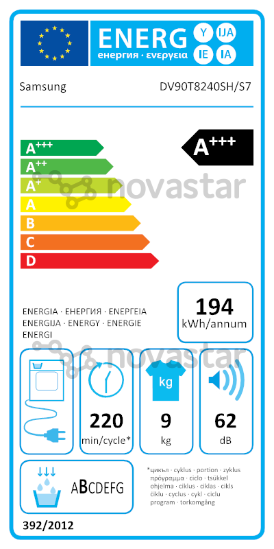 Energy consumption in kW/h per year where as a basis are taken 160 ordinary drying cycles for clothes made of cotton when using an ordinary program under full or partial load and lower energy consumption regime. Actual energy use per cycle depends on the use of the device.