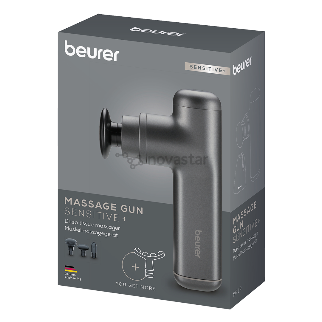 Компактный, но мощный массажный пистолет MG1R имеет длину всего 14,7 см. Благодаря 3 уровням интенсивности, 4 насадкам и аккумулятору, работающему до 3 часов, он идеально подходит для массажа чувствительных зон, таких как мышцы шеи, ног и челюсти.