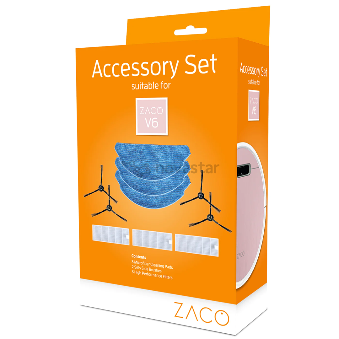 • Комплект оригинальных аксессуаров ZACO предназначен для робота-пылесоса ZACO V6 • Быстрая и простая замена аксессуаров для робота-пылесоса • Регулярное обслуживание увеличивает срок службы устройства и обеспечивает эффективную фильтрацию пыли • В комплекте: 3 мелкодисперсных фильтра, 4 боковые щетки (2 пары), 3 тряпки из микрофибры
