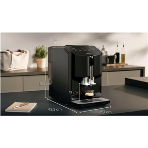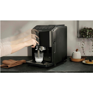 EQ300 leidžia mėgautis įvairiais kavos gėrimais vienu mygtuko paspaudimu. Aparatas turi 1,4 litro vandens talpą ir 250 gramų pupelių rezervuarą, o stilingas juodos spalvos korpusas puikiai dera prie šiuolaikiško virtuvės interjero.