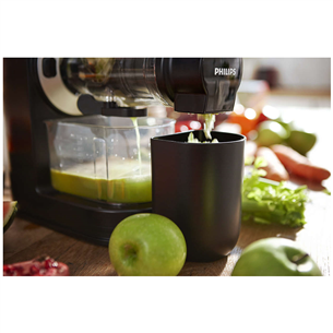 Gerkite kasdienį sveikų sulčių gurkšnį. „Philips“ lėtaeigė sulčiaspaudė – tai aukščiausios kokybės sulčių gaminimo įrenginys. Ši lėtaeigė sulčiaspaudė turi XL dydžio padavimo angą, leidžiančią spausti sultis iš visų vaisių, daržovių ir lapinių žalumynų. Prietaisą galima išvalyti vos per 90 sekundžių.